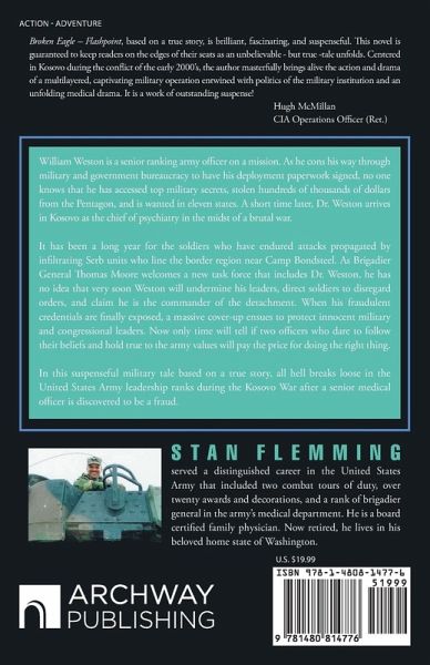 William Weston is a senior ranking army officer on a mission. As he cons his way through military and government bureaucracy to have his deployment paperwork signed, no one knows that he has accessed top military secrets, stolen hundreds of thousands of dollars from the Pentagon, and is wanted in eleven states. A short time later, Dr. Weston arrives in Kosovo as the chief of psychiatry in the midst of a brutal war. It has been a long year for the soldiers who have endured attacks propagated by infiltrating Serb units who line the border region near Camp Bondsteel. As Brigadier General Thomas Moore welcomes a new task force that includes Dr. Weston, he has no idea that very soon Weston will undermine his leaders, direct soldiers to disregard orders, and claim he is the commander of the detachment. When his fraudulent credentials are finally exposed, a massive cover-up ensues to protect innocent military and congressional leaders. Now only time will tell if two officers who dare to follow their beliefs and hold true to the army values will pay the price for doing the right thing. In this suspenseful military tale based on a true story, all hell breaks loose in the United States Army leadership ranks during the Kosovo War after a senior medical officer is discovered to be a fraud.