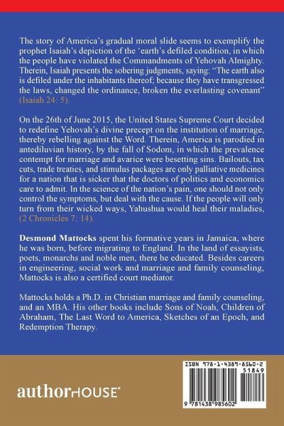 The story of America's gradual moral slide seems to exemplify the prophet Isaiah's depiction of the 'earth's defiled condition, in which the people have violated the Commandments of Yehovah Almighty. Therein, Isaiah presents the sobering judgments, saying: "The earth also is defiled under the inhabitants thereof; because they have transgressed the laws, changed the ordinance, broken the everlasting covenant" (Isaiah 24: 5). On the 26th of June 2015, the United States Supreme Court decided to redefine Yehovah's divine precept on the institution of marriage, thereby rebelling against the Word.…mehr