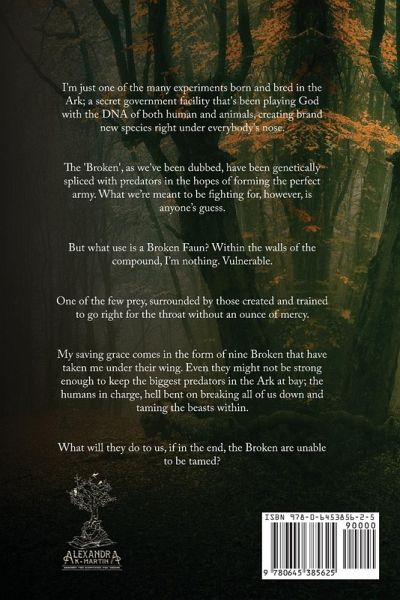 I'm just one of the many experiments born and bred in the Ark; a secret government facility that's been playing God with the DNA of both human and animals, creating brand new species right under everybody's nose. The 'Broken', as we've been dubbed, have been genetically spliced with predators in the hopes of forming the perfect army. What we're meant to be fighting for, however, is anyone's guess. But what use is a Broken Faun? Within the walls of the compound, I'm nothing. Vulnerable. One of the few prey, surrounded by those created and trained to go right for the throat without an ounce of mercy. My saving grace comes in the form of eight Broken that have taken me under their wing. Even they might not be strong enough to keep the biggest predators in the Ark at bay; the humans in charge, hell bent on breaking all of us down and taming the beasts within. What will they do to us, if in the end, the Broken are unable to be tamed? Author's note: this is a Reverse Harem Sci-Fi Romance. The main character can and will choose more than one love interest.