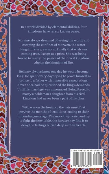 In a world divided by elemental abilities, four kingdoms have rarely known peace. Koraine always dreamed of seeing the world, and escaping the confines of Morwen, the water kingdom she grew up in. Finally that wish was coming true. Except at a price. She was being forced to marry the prince of their rival kingdom, Abelon the kingdom of fire. Bellamy always knew one day he would become king. He spent every day trying to prove himself as prince to a father with impossible expectations. Never once had he questioned the king's demands. Until his marriage was announced. Being forced to marry a nobleman's daughter from his rival kingdom had never been a part of his plan. With war on the horizon, the pair must first survive the months of traditions leading to their impending marriage. The more they resist and try to fight the inevitable, the harder they find it to deny the feelings buried deep in their hearts.