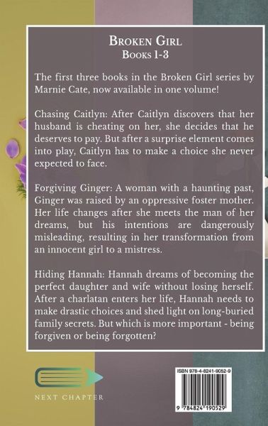 The first three books in the Broken Girl series by Marnie Cate, now available in one volume! Chasing Caitlyn: After Caitlyn discovers that her husband is cheating on her, she decides that he deserves to pay. But after a surprise element comes into play, Caitlyn has to make a choice she never expected to face. Forgiving Ginger: A woman with a haunting past, Ginger was raised by an oppressive foster mother. Her life changes after she meets the man of her dreams, but his intentions are dangerously misleading, resulting in her transformation from an innocent girl to a mistress. Hiding Hannah: Hannah dreams of becoming the perfect daughter and wife without losing herself. After a charlatan enters her life, Hannah needs to make drastic choices and shed light on long-buried family secrets. But which is more important - being forgiven or being forgotten?