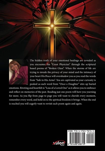 The hidden truth of your emotional healings are revealed as you encounter the "Great Physician" through the scriptural based poems of "Broken Glass". When the storms of life are trying to invade the privacy of your mind and the intimacy of your heart His Peace will overshadow you as you read the words from "Safe in His Arms". You are captivated as your curiosity is peaked as each word from "Once a Daughter" stirs up buried emotions. Riveting and heartfelt is "Loss of a Loved One" as it allows you to embrace and reflect on memories of the past. Reading just one poem will have you yearning for more. As you flip from page to page you will want to cherish every moment, remember every word, and hold on to the spiritual freedom it brings. When the end is reached you will eagerly want to revisit each poem again and again.