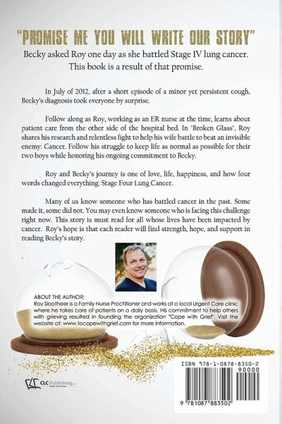 In July of 2012, after a short episode of a minor yet persistent cough, Becky's diagnosis took everyone by surprise. Follow along as Roy, working as an ER nurse at the time, learns about patient care from the other side of the hospital bed. In "Broken Glass", Roy shares his research and relentless fight to help his wife battle to beat an invisible enemy: Cancer. Follow his struggle to keep life as normal as possible for their two boys while honoring his ongoing commitment to Becky. Roy and Becky's journey is one of love, life, happiness, and how four words changed everything: Stage Four Lung Cancer. Many of us know someone who has battled cancer in the past. Some made it, some did not. You may even know someone who is facing this challenge right now. This story is must read for all whose lives have been impacted by cancer. Roy's hope is that each reader will find strength, hope, and support in reading Becky's story.