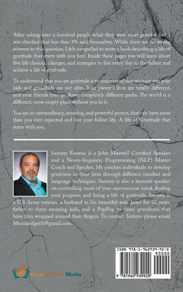 After asking over a hundred people what they were most grateful for? I was shocked that less than 5% said themselves. While there are no wrong answers to this question, I felt compelled to write a book describing a life of gratitude that starts with you first. Inside these pages you will learn about five life choices, changes, and strategies to live every day to the fullest and achieve a life of gratitude. To understand that you are gratitude is to understand that without you your kids and grandkids are not alive. Your parent's lives are totally different, and your friends' lives go down completely different paths. The world is a different, more empty place without you in it. You are an extraordinary, amazing, and powerful person, that can have more than you ever expected and live your fullest life. A life of Gratitude that starts with you.