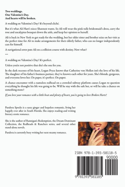 Two weddings. One Valentine's Day. And hearts will be broken. A wedding on Valentine's Day? It's beyond cliché. But it's what Ali Hart's niece Shannon wants. So Ali will wear the pink tulle bridesmaid's dress, carry the rose and eucalyptus bouquet down the aisle, and keep her opinion to herself. Ali is back in New York to get ready for the wedding, but her older sister and brother seize on her visit as the perfect time for Ali to make arrangements for their elderly father, who can no longer independently care for himself. A navigational error puts Ali on a collision course with destiny. Now what? *** A wedding on Valentine's Day? It's perfect. Unless you're not positive that she's the one for you. In the dark recesses of his heart, Logan Pryce knows that Catherine von Hollen isn't the love of his life. The daughter of his father's business partner, they've known each other for years. She's blonde, gorgeous, and everyone loves her. On paper, it's perfect. On paper. A chance encounter with a nameless redhead on a crowded subway platform causes Logan to question everything he thought his life was going to be. Will he stay with the safe bet, or will he take a chance on something more? If you love your romance with a little heat and plenty of heart, you're going to love Broken Harts! THIS STORY IS A PART OF THE FOREVER YOURS HOLIDAY COLLECTION. ALSO IN THIS COLLECTION: * Bella's Wish by International Bestselling Author Linzi Basset * All's Fair in Love and Spells by Victoria Escobar *My Italian Valentine by the USA Today & International Bestselling Author Diana Nixon