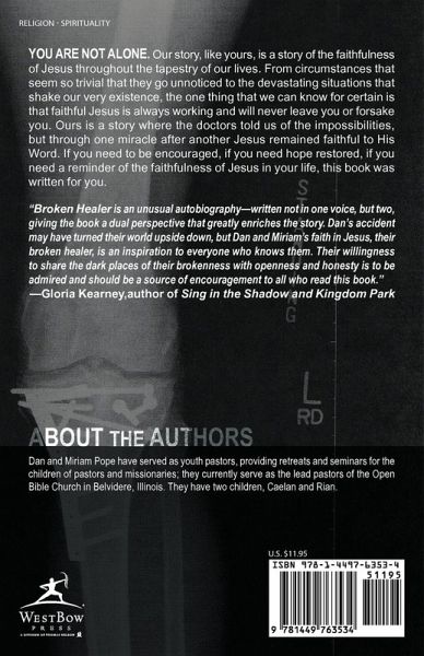 You are not alone. Our story, like yours, is a story of the faithfulness of Jesus throughout the tapestry of our lives. From circumstances that seem so trivial that they go unnoticed to the devastating situations that shake our very existence, the one thing that we can know for certain is that faithful Jesus is always working and will never leave you or forsake you. Ours is a story where the doctors told us of the impossibilities, but through one miracle after another Jesus remained faithful to His Word. If you need to be encouraged, if you need hope restored, if you need a reminder of the faithfulness of Jesus in your life, this book was written for you. "Broken Healer is an unusual autobiography-written not in one voice, but two, giving the book a dual perspective that greatly enriches the story. Dan's accident may have turned their world upside down, but Dan and Miriam's faith in Jesus, their broken healer, is an inspiration to everyone who knows them. Their willingness to share the dark places of their brokenness with openness and honesty is to be admired and should be a source of encouragement to all who read this book." -Gloria Kearney,author of Sing in the Shadow and Kingdom Park
