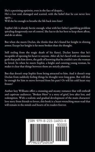 She's a persisting optimist, even in the face of despair… He's a lost soul, damaged and scarred, with the belief that he can never love again… Will she be enough to breathe the life back into him? Sophie's life is already hectic enough, what with her father's gambling problem spiraling dangerously out of control. She has to do her best to keep them afloat, and do so alone. But when she meets Declan, she thinks that she's found her knight in shining armor. Except her knight is far more broken than she thought. Still reeling from the tragic death of his fiancé, Declan knows that he's incapable of opening his heart to anyone. After all, he's faced with an immense guilt that pulls him down, the guilt of knowing that he couldn't save the woman he loved. So when he meets Sophie, a bright and cunning young woman, he makes it clear that things between them are strictly platonic. But that doesn't stop Sophie from being attracted to him. And it doesn't stop Declan from suddenly feeling things he thought were long gone. But will that be enough for him to move forward from his past? Or will his cold heart stay frozen? Author Izzy Williams offers a stunning and steamy romance that will enthrall and captivate audiences. "Broken Hero" is a story of grief, love after loss, and redemption. With a realistic and gradual development of the main characters' love story from friends to lovers, this book is a heart-wrenching must-read that will remain in the minds and hearts of its readers forever.