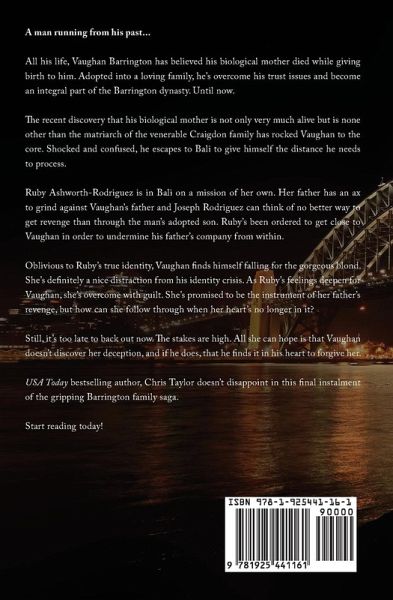 A man running from his past... All his life, Vaughan Barrington has believed his biological mother died while giving birth to him. Adopted into a loving family, he's overcome his trust issues and become an integral part of the Barrington dynasty. Until now. The recent discovery that his biological mother is not only very much alive but is none other than the matriarch of the venerable Craigdon family has rocked Vaughan to the core. Shocked and confused, he escapes to Bali to give himself the distance he needs to process. Ruby Ashworth-Rodriguez is in Bali on a mission of her own. Her father has an ax to grind against Vaughan's father and Joseph Rodriguez can think of no better way to get revenge than through the man's adopted son. Ruby's been ordered to get close to Vaughan in order to undermine his father's company from within. Oblivious to Ruby's true identity, Vaughan finds himself falling for the gorgeous blond. She's definitely a nice distraction from his identity crisis. As Ruby's feelings deepen for Vaughan, she's overcome with guilt. She's promised to be the instrument of her father's revenge, but how can she follow through when her heart's no longer in it? Still, it's too late to back out now. The stakes are high. All she can hope is that Vaughan doesn't discover her deception, and if he does, that he finds it in his heart to forgive her. USA Today bestselling author, Chris Taylor doesn't disappoint in this final instalment of the gripping Barrington family saga. Start reading today!