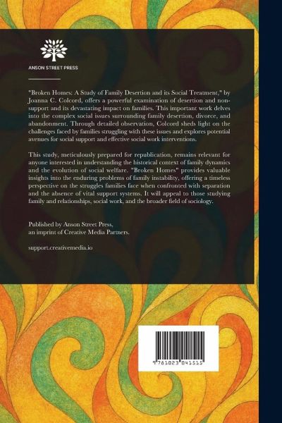 "Broken Homes: A Study of Family Desertion and its Social Treatment," by Joanna C. Colcord, offers a powerful examination of desertion and non-support and its devastating impact on families. This important work delves into the complex social issues surrounding family desertion, divorce, and abandonment. Through detailed observation, Colcord sheds light on the challenges faced by families struggling with these issues and explores potential avenues for social support and effective social work interventions. This study, meticulously prepared for republication, remains relevant for anyone interested in understanding the historical context of family dynamics and the evolution of social welfare. "Broken Homes" provides valuable insights into the enduring problems of family instability, offering a timeless perspective on the struggles families face when confronted with separation and the absence of vital support systems. It will appeal to those studying family and relationships, social work, and the broader field of sociology. This work has been selected by scholars as being culturally important, and is part of the knowledge base of civilization as we know it. This work is in the public domain in the United States of America, and possibly other nations. Within the United States, you may freely copy and distribute this work, as no entity (individual or corporate) has a copyright on the body of the work. Scholars believe, and we concur, that this work is important enough to be preserved, reproduced, and made generally available to the public. We appreciate your support of the preservation process, and thank you for being an important part of keeping this knowledge alive and relevant.