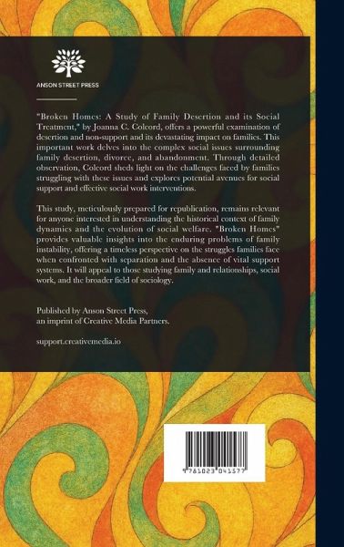 "Broken Homes: A Study of Family Desertion and its Social Treatment," by Joanna C. Colcord, offers a powerful examination of desertion and non-support and its devastating impact on families. This important work delves into the complex social issues surrounding family desertion, divorce, and abandonment. Through detailed observation, Colcord sheds light on the challenges faced by families struggling with these issues and explores potential avenues for social support and effective social work interventions. This study, meticulously prepared for republication, remains relevant for anyone interested in understanding the historical context of family dynamics and the evolution of social welfare. "Broken Homes" provides valuable insights into the enduring problems of family instability, offering a timeless perspective on the struggles families face when confronted with separation and the absence of vital support systems. It will appeal to those studying family and relationships, social work, and the broader field of sociology. This work has been selected by scholars as being culturally important, and is part of the knowledge base of civilization as we know it. This work is in the public domain in the United States of America, and possibly other nations. Within the United States, you may freely copy and distribute this work, as no entity (individual or corporate) has a copyright on the body of the work. Scholars believe, and we concur, that this work is important enough to be preserved, reproduced, and made generally available to the public. We appreciate your support of the preservation process, and thank you for being an important part of keeping this knowledge alive and relevant.