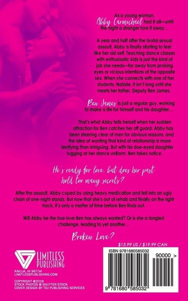 As a young woman, Abby Carmichael had it all-until the night a stranger tore it away... A year and half after the brutal sexual assault, Abby is finally starting to feel like her old self. Teaching dance classes with enthusiastic kids is just the kind of job she needs-far away from probing eyes or vicious intentions of the opposite sex. When she connects with one of her students, Natalie, it isn't long until she meets her father, Deputy Ben James. Ben James is just a regular guy, working to make a life for himself and his daughter... That's what Abby tells herself when her sudden attraction for Ben catches her off guard. Abby has been steering clear of men for obvious reasons, and the idea of wanting that kind of relationship is more terrifying than intriguing. But with his doe-eyed daughter tugging at her dance uniform, Ben takes notice. He's ready for love, but does her past hold too many secrets? After the assault, Abby coped by using heavy medication and fell into an ugly chain of one-night stands. But now that she's out of rehab and finally on the right track, it's only a matter of time before Ben finds out. Will Abby be the true love Ben has always wanted? Or is she a tangled challenge, leading to yet another... Broken Love?