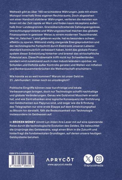 In BROKEN MONEY nimmt Lyn Alden ihre Leser mit auf eine spannende Reise durch die technologische Evolution des Geldes. Sie beleuchtet die Ursprünge des Geldwesens, wagt einen Blick in die Zukunft und hinterfragt die fundamentalen Grundlagen, auf denen unsere heutigen Geldsysteme beruhen.