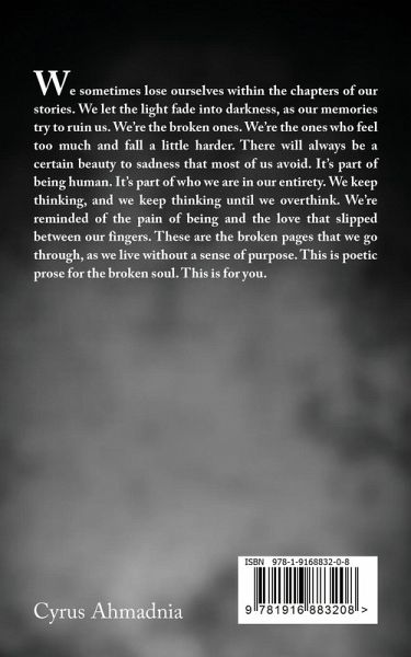 This is poetic prose for the broken soul. The debut book from Papikins delves into the mind of an overthinker, as words are poetically merged together to give an understanding of what it means to love and to lose. Broken Pages is an experiential journey which places the reader through various thought processes to become self-aware of their feelings. The sole purpose of writing is to create a connection, and Papikins' hard-hitting emotional writing style brings out the fire within individuals, as the writer has been connecting to a large audience of 40,000 followers on Instagram for many years. Broken Pages We sometimes lose ourselves within the chapters of our stories. We let the light fade into darkness, as our memories try to ruin us. We're the broken ones. We're the ones who feel too much and fall a little harder. There will always be a certain beauty to sadness that most of us avoid. It's part of being human. It's part of who we are in our entirety. We keep thinking, and we keep thinking until we overthink. We're reminded of the pain of being and the love that slipped between our fingers. These are the broken pages that we go through, as we live without a sense of purpose. This is poetic prose for the broken soul. This is for you.