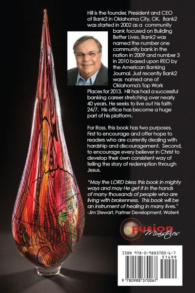 Ross is the founder, President and CEO of Bank2 in Oklahoma City, OK. Bank2 was started in 2002 as a community bank with a mission to Build Better Lives. Bank2 was named the number one community bank in the nation in 2009 and number 3 in 2010 based upon REO by the American Banking Journal. Bank2 was named one of Oklahoma's T0p Work Places in 2013. Hill seeks to live out his faith 24/7. His office has become a huge part of his platform. For Ross, this book has two purposes. First to encourage and offer hope to readers who are currently dealing with hardship and discouragement. Second to encourage every believer in Christ to develop their own consistent way of telling the story of redemption through Jesus.