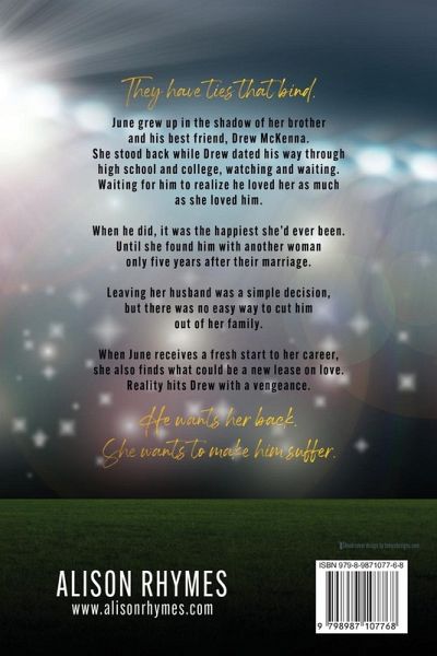 They have ties that bind. June grew up in the shadow of her brother and his best friend, Drew McKenna. She stood back while Drew dated his way through high school and college, watching and waiting. Waiting for him to realize he loved her as much as she loved him. When he did, it was the happiest she'd ever been. Until she found him with another woman only five years after their marriage. Leaving her husband was a simple decision, but there was no easy way to cut him out of her family. When June receives a fresh start to her career, she also finds what could be a new lease on love. Reality hits Drew with a vengeance. He wants her back. She wants to make him suffer. *This is a stand-alone title as part of a companion series*