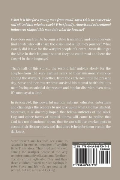 What is it like for a young man from small-town Ohio to answer the call of God into mission work? What family, church and educational influences shaped this man into what he became? How does one train to become a Bible translator? And how does one find a wife who will share the vision and a lifetime's journey? What exactly did it take for the Warlpiri people of Central Australia to get the Bible in their language so that they too could read and hear the Gospel in their language? That's half of this story... the second half unfolds slowly for the couple-from the very earliest years of their missionary service among the Warlpiri. Together, from the early 80s until the present day, Steve and Bev Swartz have survived his mental health frailties manifesting as suicidal depression and bipolar disorder. Even now, it's one day at a time. In Broken Pot, this powerful memoir informs, educates, entertains and challenges the readers to not give up on what God has started. Moreover, it is sincerely hoped that fellow-sufferers of the Black Dog and other forms of mental illness will come to realise that God has not abandoned them, that He can still use cracked pots to accomplish His purposes, and that there is help for them even in the darkness.