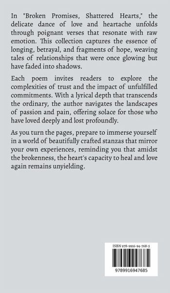 In "Broken Promises, Shattered Hearts," the delicate dance of love and heartache unfolds through poignant verses that resonate with raw emotion. This collection captures the essence of longing, betrayal, and fragments of hope, weaving tales of relationships that were once glowing but have faded into shadows. Each poem invites readers to explore the complexities of trust and the impact of unfulfilled commitments. With a lyrical depth that transcends the ordinary, the author navigates the landscapes of passion and pain, offering solace for those who have loved deeply and lost profoundly. As you turn the pages, prepare to immerse yourself in a world of beautifully crafted stanzas that mirror your own experiences, reminding you that amidst the brokenness, the heart's capacity to heal and love again remains unyielding.
