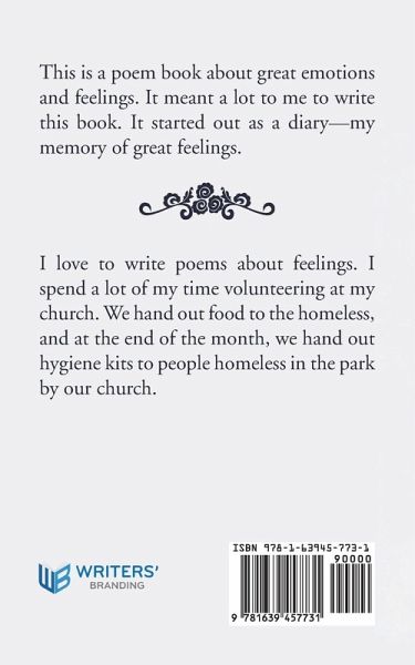 Book Synopsis This is a poem book about great emotions and feelings. It meant a lot to me to write this book. It started out as a diary-my memory of great feelings. Autobiography I love to write poems about feelings. I spend a lot of my time volunteering at my church. We hand out food to the homeless, and at the end of the month, we hand out hygiene kits to people homeless in the park by our church.