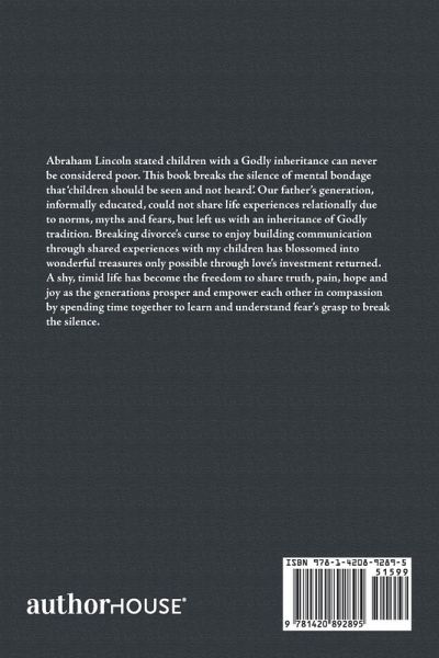 Abraham Lincoln stated children with a Godly inheritance can never be considered poor. This book breaks the silence of mental bondage that 'children should be seen and not heard'. Our father's generation, informally educated, could not share life experiences relationally due to norms, myths and fears, but left us with an inheritance of Godly tradition. Breaking divorce's curse to enjoy building communication through shared experiences with my children has blossomed into wonderful treasures only possible through love's investment returned. A shy, timid life has become the freedom to share truth, pain, hope and joy as the generations prosper and empower each other in compassion by spending time together to learn and understand fear's grasp to break the silence.
