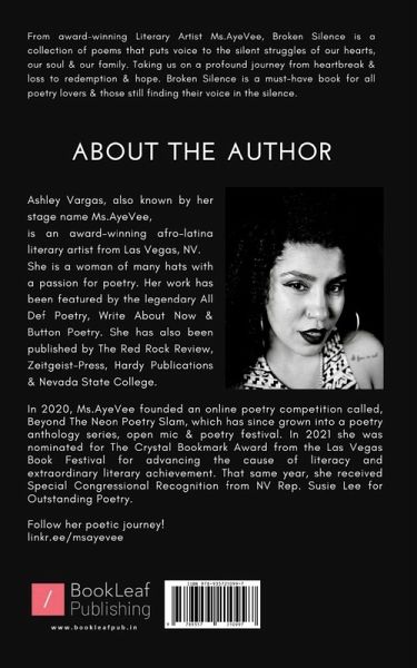 From award-winning Literary Artist Ms.AyeVee, Broken Silence is a collection of poems that puts voice to the silent struggles of our hearts, our soul & our family. Taking us on a profound journey from heartbreak & loss to redemption & hope. Broken Silence is a must-have book for all poetry lovers & those still finding their voice in the silence.