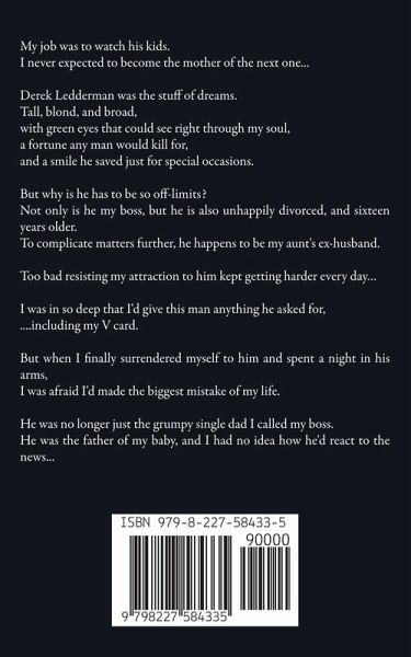 My job was to watch his kids. I never expected to become the mother of the next one... Derek Ledderman was the stuff of dreams. Tall, blond, and broad, with green eyes that could see right through my soul, a fortune any man would kill for, and a smile he saved just for special occasions. But why is he has to be so off-limits? Not only is he my boss, but he is also unhappily divorced, and sixteen years older. To complicate matters further, he happens to be my aunt's ex-husband. Too bad resisting my attraction to him kept getting harder every day... I was in so deep that I'd give this man anything he asked for, ....including my V card. But when I finally surrendered myself to him and spent a night in his arms, I was afraid I'd made the biggest mistake of my life. He was no longer just the grumpy single dad I called my boss. He was the father of my baby, and I had no idea how he'd react to the news...