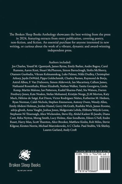 The Broken Sleep Books Anthology showcases the best writing from the press in 2024, featuring extracts from every publication, covering poetry, non-fiction, and fiction. An essential purchase for anyone interested in new writing, or curious about the work of a vibrant, dynamic and award-winning independent press. Authors included: Jos Charles, Yousif M. Qasmiyeh, James Byrne, Emily Barker, Andre Bagoo, Carol Rumens, Aaron Kent, Stuart McPherson, Simon Barraclough, Síofra McSherry, Otamere Guobadia, Vikram Kolmannskog, Luke Palmer, Nikki Dudley, Christopher Arksey. Jaydn DeWald, Pippa Goldschmidt, Charley Barnes, Raymond de Borja, Astrid Alben, F. Van Dixhoorn, Simon Alderwick, Ian Macartney, Callum James, Nathaniel Rosenthalis, Rhian Elizabeth, Nathan Walker, Yanita Georgieva, Linda Kemp, Martin Malone, Ian Patterson, Kashif Sharma-Patel, Stu Watson, Darren Freebury-Jones, Kate Noakes, Stefan Mohamed, Kristján Norge, JLM Morton, Katy Mack, Héloïse de Satgé, Kat Dixon, Víctor Rodríguez Núñez, Katherine M. Hedeen, Ryan Norman, Caleb Nichols, Stephen Emmerson, Antony Owen, Wendy Allen, Emily Abdeni-Holman, Jordan Hamel, Gerry McGrath, Rushika Wick, James Roome, adrija ghosh, Anna Vaught, Joshua Jones, Mägorzata Lebda, El¿bieta Wójcik-Leese, Stephanie Ní Thiarnaigh, Alice Wickenden, Steve Ely, Abdul Kadeer El-Janabi, Diana Cant, Réka Nyitrai, Morag Smith, Lucy Holme, Alan Sondheim, Eileen G'Sell, Endre Ruset, Harry Man, Scott Thurston, Alice Brooker, Matthew Kinlin, Rob Miles, Stevie Kilgour, Kirsten Norrie, Michael Marcinkowski, A C Clarke. Paul Stubbs, Vik Shirley, Lauren Garland, Andy Croft