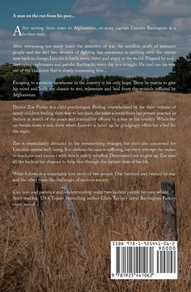 A man on the run from his past...After serving three tours in Afghanistan, ex-army captain Lincoln Barrington is a broken man.After witnessing too many times the atrocities of war, the needless death of innocent people and the fact two decades of fighting has amounted to nothing with the enemy now back in charge, Lincoln is battle worn, bitter and angry at the world. Plagued by soul-destroying nightmares and painful flashbacks, every day is a struggle. He can't see his way out of the blackness that is slowly consuming him...Escaping to a remote farmhouse in the country is his only hope. There he yearns to give his mind and body the chance to rest, rejuvenate and heal from the wounds inflicted by Afghanistan.Doctor Zoe Parker is a child psychologist. Feeling overwhelmed by the sheer volume of needy children finding their way to her door, she takes a break from her private practice in Sydney in search of the peace and tranquillity offered by a stay in the country. When her car breaks down a mile from where Lincoln is holed up, he grudgingly offers her a bed for the night.Zoe is immediately attracted to the mesmerizing stranger, but she's also concerned for Lincoln's mental well-being. It is obvious the man is suffering, but every attempt she makes to reach out and connect with him is rudely rebuffed. Determined not to give up, Zoe uses all the tools at her disposal to help him through the darkest time of his life.What follows is a remarkable love story of two people. One battered and bruised by war and the other from the challenges of modern society.Can love and patience and understanding make two broken people become whole...?Start reading USA Today bestselling author Chris Taylor's latest Barrington Family story today!