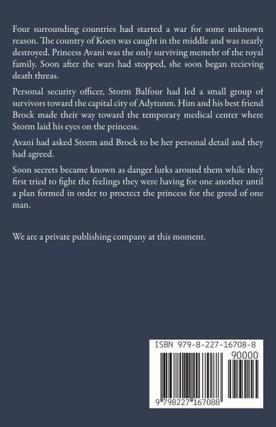 Four surrounding countries had started a war for some unknown reason. The country of Koen was caught in the middle and was nearly destroyed. Princess Avani was the only surviving memebr of the royal family. Soon after the wars had stopped, she soon began recieving death threas. Personal security officer, Storm Balfour had led a small group of survivors toward the capital city of Adytunm. Him and his best friend Brock made their way toward the temporary medical center where Storm laid his eyes on the princess. Avani had asked Storm and Brock to be her personal detail and they had agreed. Soon secrets became known as danger lurks around them while they first tried to fight the feelings they were having for one another until a plan formed in order to proctect the princess for the greed of one man.