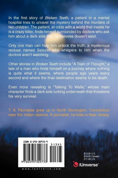 In the first story of Broken Teeth, a patient in a mental hospital tries to unravel the mystery behind the murders of two children. The patient, at odds with a world that insists he is a crazy killer, finds himself surrounded by doctors who ask him about a dark side that he believes doesn't exist. Only one man can help him unlock the truth, a mysterious recluse named Salazar who whispers to him when the doctors aren't watching. Other stories in Broken Teeth include "A Train of Thought," a tale of a man who finds himself on a journey where nothing is quite what it seems, where people age years every second and where the final destination seems to be death. Even more revealing is "Talking To Walls," whose main character finds a dark side lurking underneath that threatens his very survival.