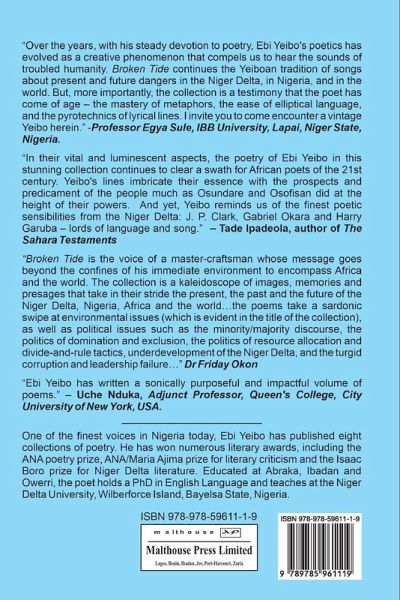 One of the finest voices in Nigeria today, Ebi Yeibo has published eight collections of poetry. He has won numerous literary awards, including the ANA poetry prize. He teaches at the Niger Delta University, Bayelsa State, Nigeria. Broken Tide continues the Yeiboan tradition of songs about present and future dangers in the Niger Delta, in Nigeria and in the world.