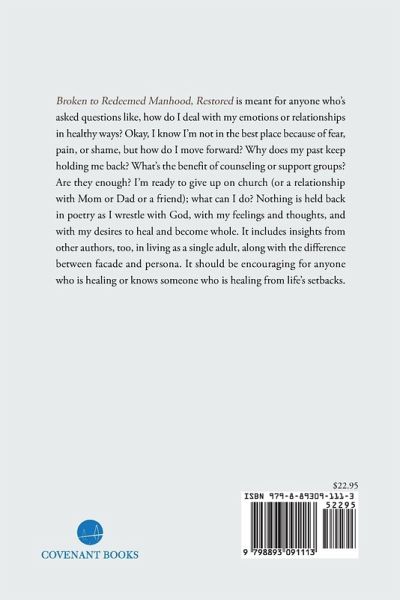 Broken to Redeemed Manhood, Restored is meant for anyone who's asked questions like, how do I deal with my emotions or relationships in healthy ways? Okay, I know I'm not in the best place because of fear, pain, or shame, but how do I move forward? Why does my past keep holding me back? What's the benefit of counseling or support groups? Are they enough? I'm ready to give up on church (or a relationship with Mom or Dad or a friend); what can I do? Nothing is held back in poetry as I wrestle with God, with my feelings and thoughts, and with my desires to heal and become whole. It includes insights from other authors, too, in living as a single adult, along with the difference between facade and persona. It should be encouraging for anyone who is healing or knows someone who is healing from life's setbacks.