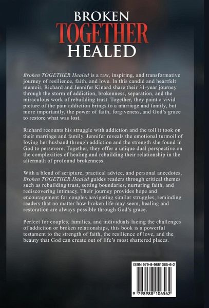 Broken TOGETHER Healed is a raw, inspiring, and transformative journey of resilience, faith, and love. In this candid and heartfelt memoir, Richard and Jennifer Kinard share their 31-year journey through the storm of addiction, brokenness, separation, and the miraculous work of rebuilding trust. Together, they paint a vivid picture of the pain addiction brings to a marriage and family, but more importantly, the power of faith, forgiveness, and God's grace to restore what was lost. Richard recounts his struggle with addiction and the toll it took on their marriage and family. Jennifer reveals the emotional turmoil of loving her husband through addiction and the strength she found in God to persevere. Together, they offer a unique dual perspective on the complexities of healing and rebuilding their relationship in the aftermath of profound brokenness. With a blend of scripture, practical advice, and personal anecdotes, Broken TOGETHER Healed guides readers through critical themes such as rebuilding trust, setting boundaries, nurturing faith, and rediscovering intimacy. Their journey provides hope and encouragement for couples navigating similar struggles, reminding readers that no matter how broken life may seem, healing and restoration are always possible through God's grace. Perfect for couples, families, and individuals facing the challenges of addiction or broken relationships, this book is a powerful testament to the strength of faith, the resilience of love, and the beauty that God can create out of life's most shattered places.