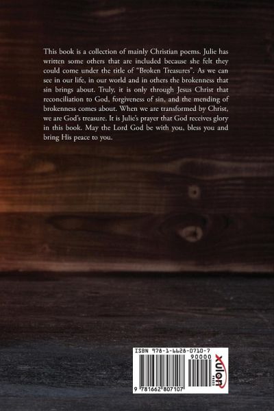 This book is a collection of mainly Christian poems. Julie has written some others that are included because she felt they could come under the title of "Broken Treasures". As we can see in our life, in our world and in others the brokenness that sin brings about. Truly, it is only through Jesus Christ that reconciliation to God, forgiveness of sin, and the mending of brokenness comes about. When we are transformed by Christ, we are God's treasure. It is Julie's prayer that God receives glory in this book. May the Lord God be with you, bless you and bring His peace to you.
