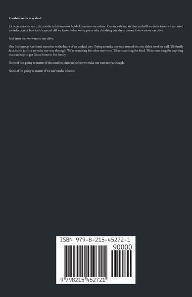 Zombies never stay dead. It's been a month since the zombie infection took hold of humans everywhere. One month and six days and still we don't know what started the infection or how far it's spread. All we know is that we've got to take this thing one day at a time if we want to stay alive. And trust me: we want to stay alive. Our little group has found ourselves in the heart of an undead city. Trying to make our way around the city didn't work so well. We finally decided to just try to make our way through. We're searching for other survivors. We're searching for food. We're searching for anything that can help us get Greta home to her family. None of it is going to matter if the zombies claim us before we make our next move, though. None of it's going to matter if we can't make it home.