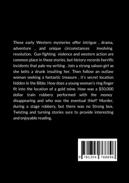 These early Western mysteries offer intrigue , drama, adventure , and unique circumstances involving resolution. Gun fighting violence and western action are common place in these stories, but history records horrific incidents that pale my writing . Join a strong saloon girl as she belts a drunk insulting her. Then follow an outlaw woman seeking a fantastic treasure , it's secret location hidden in the Bible. How does a young woman's ring finger fit into the location of a gold mine. How was a $50,000 dollar train robbery performed with the money disappearing and who was the eventual thief? Murder, during a stage robbery, but there was no Strong box. Twisting and turning stories sure to provide interesting and enjoyable reading. Thanks for the summary read- Hope you enjoy.