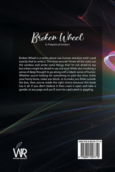 Broken Wheel is a series about raw human emotion and I used exactly that to write it. This time around I threw all the rules out the window and wrote some things that I'm not afraid to say but others might be afraid to say out loud. While also invoking a sense of deep thought to go along with a (dark) sense of humor. Whether you're looking for something to pass the time, tickle your funny bone, make you blush, or to make you think outside the box, then you've made the right choice because this book has it all. If you don't believe it then crack it open and take a gander at any page and you'll soon be captivated or giggling.