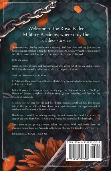 Welcome to the Royal Rider Military Academy, where only the ruthless survive. Twenty-year-old Ainsley No-Name is nothing. She's less than nothing. Just another faceless orphan stealing to feed her foster brothers and sisters. When three men snatch her off the street and drag her into the woods, she knows it's the end. Until she came. Scales the color of flame and brimstone, a dragon drops out of the sky and saves her. With that, the sacred bond between rider and dragon is formed... ...and her execution is set in stone. In Adalinda, there is one law held above all else. Any peasant who bonds with a dragon will be put to death. Left with no choice, Ainsley claims the only royal line that can't be traced. The Royal House of Boreen, daughter of the missing Queen Kisandra, and heir to the throne of Adalinda. A simple plot to keep her life and her dragon becomes anything but. The powers behind the throne will not bow down to a mysterious waif who appeared out of nowhere, and his name is Dominic Roark. Handsome, powerful, infuriating, teasing Dominic wants her dead. He wants the dragon she stole from him. He wants the throne she claimed as her birthright. Their enemies are getting stronger, bolder, and closer. With each strike from the shadows, they're bringing Adalinda to the brink of a war the kingdom won't survive. But Dominic... his war is with her.