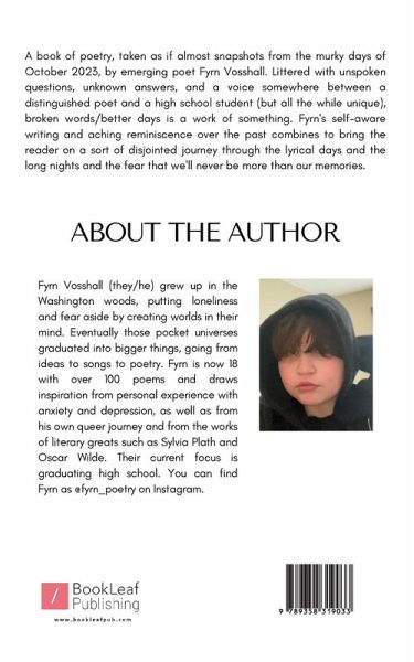 A book of poetry, taken as if almost snapshots from the murky days of October 2023, by emerging poet Fyrn Vosshall. Littered with unspoken questions, unknown answers, and a voice somewhere between a distinguished poet and a high school student (but all the while unique), broken words/better days is a work of something. Fyrn's self-aware writing and aching reminiscence over the past combines to bring the reader on a sort of disjointed journey through the lyrical days and the long nights and the fear that we'll never be more than our memories.