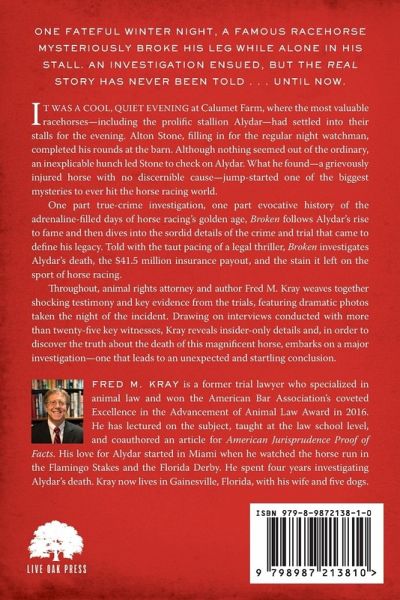 One fateful winter night, a famous racehorse mysteriously broke his leg while alone in his stall. An investigation ensued, but the real story has never been told...until now. It was a cool, quiet evening at Calumet Farm, where the most valuable racehorses-including the prolific stallion Alydar-had settled into their stalls for the evening. Alton Stone, filling in for the regular night watchman, completed his rounds at the barn. Although nothing seemed out of the ordinary, an inexplicable hunch led Stone to check on Alydar. What he found-a grievously injured horse with no discernible cause-jump-started one of the biggest mysteries to ever hit the horse racing world. One part true-crime investigation, one part evocative history of the adrenaline-filled days of horse racing's golden age, Broken follows Alydar's rise to fame and then dives into the sordid details of the crime and trial that came to define his legacy. Told with the taut pacing of a legal thriller, Broken investigates Alydar's death, the $41.5 million insurance payout, and the stain it left on the sport of horse racing. Throughout, animal rights attorney and author Fred M. Kray weaves together shocking testimony and key evidence from the trials, featuring dramatic photos taken the night of the incident. Drawing on interviews conducted with more than twenty-five key witnesses, Kray reveals insider-only details and, in order to discover the truth about the death of this magnificent horse, embarks on a major investigation-one that leads to an unexpected and startling conclusion.