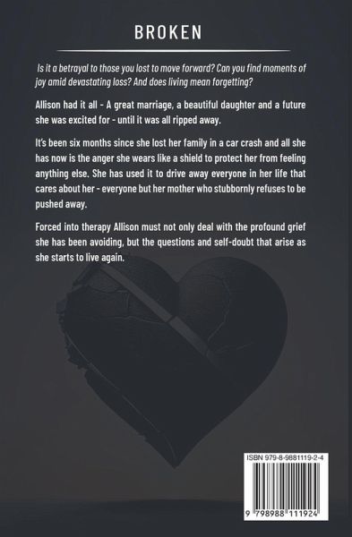 Is it a betrayal to those you lost to move forward? Can you find moments of joy amid devastating loss? And does living mean forgetting? Allison had it all - A great marriage, a beautiful daughter and a future she was excited for - until it was all ripped away. It's been six months since she lost her family in a car crash and all she has now is the anger she wears like a shield to protect her from feeling anything else. She has used it to drive away everyone in her life that cares about her - everyone but her mother who stubbornly refuses to be pushed away. Forced into therapy Allison must not only deal with the profound grief she has been avoiding, but the questions and self-doubt that arise as she starts to live again.