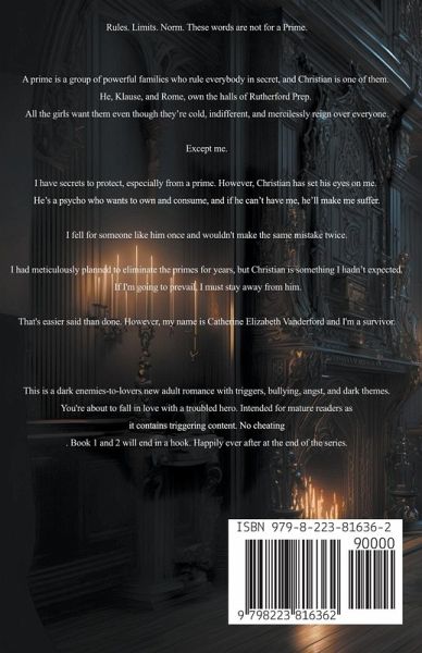 Rules. Limits. Norm. These words are not for a Prime. A prime is a group of powerful families who rule everybody in secret, and Christian is one of them. He, Klause, and Rome, own the halls of Rutherford Prep. All the girls want them even though they're cold, indifferent, and mercilessly reign over everyone. Except me. I have secrets to protect, especially from a prime. However, Christian has set his eyes on me. He's a psycho who wants to own and consume, and if he can't have me, he'll make me suffer. I fell for someone like him once and wouldn't make the same mistake twice. I had meticulously planned to eliminate the primes for years, but Christian is something I hadn't expected. If I'm going to prevail, I must stay away from him. That's easier said than done. However, my name is Catherine Elizabeth Vanderford and I'm a survivor. This is a dark enemies-to-lovers new adult romance with triggers, bullying, angst, and dark themes. You're about to fall in love with a troubled hero. Intended for mature readers as it contains triggering content. No cheating, and a happily ever after.
