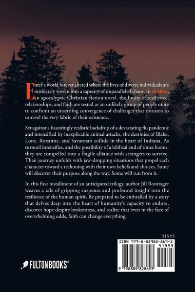 Enter a world forever altered where the lives of diverse individuals are intricately woven into a tapestry of unparalleled chaos. In Broken, an apocalyptic Christian fiction novel, the limits of resilience, relationships, and faith are tested as an unlikely group of people unite to confront an unsettling convergence of challenges that threaten to unravel the very fabric of their existence. Set against a hauntingly realistic backdrop of a devastating flu pandemic and intensified by inexplicable animal attacks, the destinies of Blake, Lone, Roxanne, and Savannah collide in the heart of Indiana. As turmoil intensifies, and the possibility of a biblical end of times looms, they are compelled into a fragile alliance with strangers to survive. Their journey unfolds with jaw-dropping situations that propel each character toward a reckoning with their own beliefs and choices. Some will discover their purpose along the way. Some will run from it. In this first installment of an anticipated trilogy, author Jill Bontrager weaves a tale of gripping suspense and profound insight into the resilience of the human spirit. Be prepared to be enthralled by a story that delves deep into the heart of humanity's capacity to endure, discover hope despite brokenness, and realize that even in the face of overwhelming odds, faith can change everything.