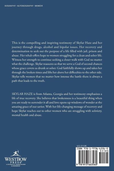 This is the compelling and inspiring testimony of Skylar Haze and her journey through drugs, alcohol and bipolar issues. Her recovery and determination to seek out the purpose of a life filled with jail, prison and abuse. Her rehab offers hope to women struggling for a clean and sober life. Witness her strength to continue seeking a closer walk with God no matter what the challenge. Skylar reassures us that we serve a God of second chances whose grace covers us drunk or sober. God faithfully shows up and takes her through the broken times and lifts her above her difficulties to the other side. Skylar tells women that no matter how intense the battle there is always a path that leads to the truth.
