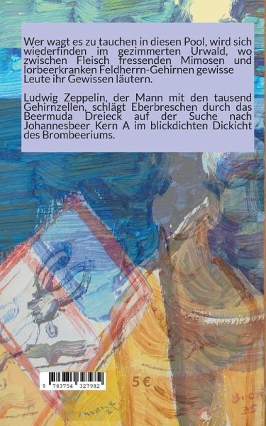 Wer wagt es zu tauchen in diesen Pool, wird sich wiederfinden im gezimmerten Urwald, wo zwischen Fleisch fressenden Mimosen und lorbeerkranken Feldherrn-Gehirnen gewisse Leute ihr Gewissen läutern.Ludwig Zeppelin, der Mann mit den tausend Gehirnzellen, schlägt Eberbreschen durch das Beermuda Dreieck auf der Suche nach Johannesbeer Kern A im blickdichten Dickicht des Brombeeriums.