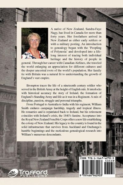 Brompton traces the life of a nineteenth century soldier who served in the British Army at the height of English rule. It interlocks with historical accuracy the story of Ireland, the formation of England's Standing Army and life as it was in a Regiment. A mix of discipline, passion, struggle and personal triumphs. From Portugal to Australia to India with his regiment, William Smith endures campaign hardship, tragedy and tropical illness. He remarries and is repatriated back to Ireland, but his retirement coincides with Ireland's crisis, the 1840's famine. Acceptance into the Royal New Zealand Fencible Corps offers a new life establishing the colony of New Zealand. His legacy to the country is found in the solid infrastructure that survives from Auckland and Onehunga's humble beginnings and the meticulous genealogical research into William's numerous descendants.