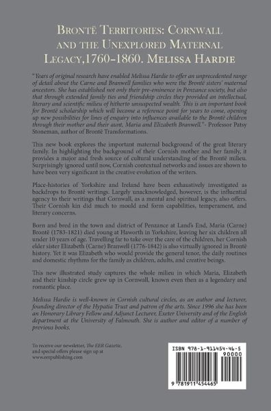 'Actually... the Bronte girls got their literary talent from the Carne side, as their Aunt Elizabeth spun wonderfully wild and woolly tales of Cornwall. So there!' Philip Carne / This new book explores the important maternal background of the great literary family. In highlighting the background of their Cornish mother and her family, it provides a major and fresh source of cultural understanding of the Brontё milieu. Surprisingly ignored until now, Cornish contextual networks and issues are shown to have been very significant in the creative evolution of the writers. / Place-histories of Yorkshire and Ireland have been exhaustively investigated as backdrops to Bront¿ writings. Largely unacknowledged, however, is the influential agency to their writings that Cornwall, as a mental and spiritual legacy, also offers. / This new illustrated study captures the whole milieu in which Maria, Elizabeth and their kinship circle grew up in Cornwall, known even then as a legendary and romantic place. In their everyday life were a number of journalists, travellers, poets, story-tellers, and published academics, critically influential in their day. Contents: Author's note and acknowledgements. List of illustrations. Introduction. Part 1: Place and time / Living at the edge: the Penwith Hundred; Creators of Penzance; A legendary place: stories and storytellers; And then came Wesley; The everyday. / Part 2. 'sisters and the cousins and aunts'. / The naming game: Identification and patterns; Branwells with links: Bronte, Carne, H. Davy (PRS), Botterell, Fennell, Batten, Johns, Kingston, Pellew & Carthew Reynolds, Lovett (Chartist); Carnes with links: Cock, Polwhele, Fox, Bolitho, Vyvyan, Southey, Thackeray, Coleridge, Davies Giddy Gilbert (PRS), Wesley brothers. Battens with links: Cristal, Wollstonecraft, Malthus, G Dyer, Clapham Sect, L Stephen (V Woolf). The John/Johns with links: Arundell, H Martyn (missionary), C Kingsley. Charles A Johns. / The Document register / Index