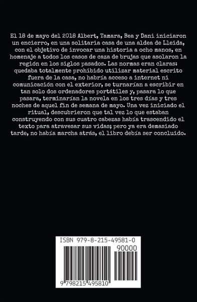 El 18 de mayo del 2018 Albert, Tamara, Bea y Dani iniciaron un encierro, en una solitaria casa de una aldea de Lleida, con el objetivo de invocar una historia a ocho manos, en homenaje a todos los casos de caza de brujas que asolaron la región en los siglos pasados. Las normas eran claras: quedaba totalmente prohibido utilizar material escrito fuera de la casa, no habría acceso a internet ni comunicación con el exterior, se turnarían a escribir en tan solo dos ordenadores portátiles y, pasara lo que pasara, terminarían la novela en los tres días y tres noches de aquel fin de semana de mayo. Una vez iniciado el ritual, descubrieron que tal vez lo que estaban construyendo con sus cuatro cabezas había trascendido el texto para atravesar sus vidas; pero ya era demasiado tarde, no había marcha atrás, el libro debía ser concluido.