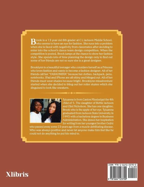 Brook is a 13 year old 8th grader at C L Jackson Middle School, who seems to have an eye for fashion. She runs into a problem when she is faced with negativity from classmates after deciding to enter into the school's dance team design competition. When the competition is posted, Brook jumps at the chance to show her fashion style. She spends lots of time planning the design only to find out some of her friends are not so sure she is a great designer. Brooklynn is a beautiful teenager who considers herself as a Princess who loves fashion and wants to become a fashion designer. All of her friends call her "FASHONISTA" because her clothes, backpack, pens, notebooks, IPad and IPhone are all shiny and blinged out. All of her friends must wear shades because bright. Brooklynn misadventure started when she decided to bling out her roller skates which she disguised to look like sneakers.