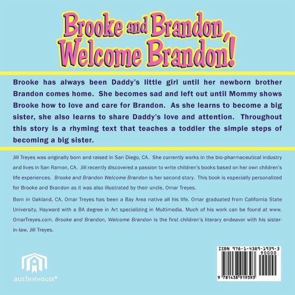 Brooke has always been Daddy's little girl until her newborn brother Brandon comes home. She becomes sad and left out until Mommy shows Brooke how to love and care for Brandon. As she learns to become a big sister, she also learns to share Daddy's love and attention. Throughout this story is a rhyming text that teaches a toddler the simple steps of becoming a big sister.