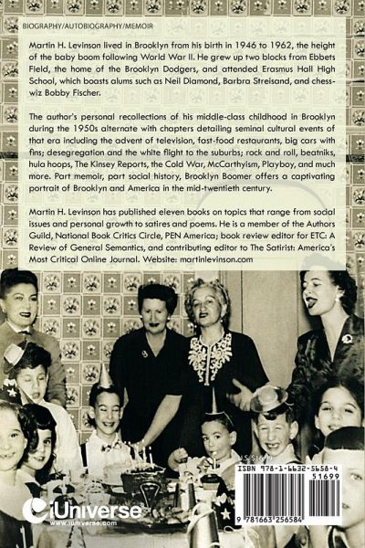 Martin H. Levinson lived in Brooklyn from his birth in 1946 to 1962, the height of the baby boom following World War II. He grew up two blocks from Ebbets Field, the home of the Brooklyn Dodgers, and attended Erasmus Hall High School, which boasts alums such as Neil Diamond, Barbra Streisand, and chess-wiz Bobby Fischer. The author's personal recollections of his middle-class childhood in Brooklyn during the 1950s alternate with chapters detailing seminal cultural events of that era including the advent of television, fast-food restaurants, big cars with fins; desegregation and the white flight to the suburbs; rock 'n' roll, beatniks, hula hoops, the Kinsey Reports, the Cold War, McCarthyism, Playboy, and much more. Part memoir, part social history, Brooklyn Boomer offers a captivating portrait of Brooklyn and America in the mid-twentieth Century.